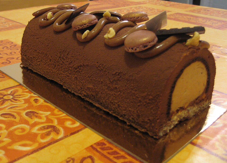 Den Biskuit von der anderen Längsseite her vorsichtig zusammenrollen und mit dem Schluss nach unten auf eine Servierplatte legen. Rundum mit der restlichen Creme bestreichen und mit einer Gabel längs Rillen ziehen, um so die Struktur eines Baumstammes anzudeuten.